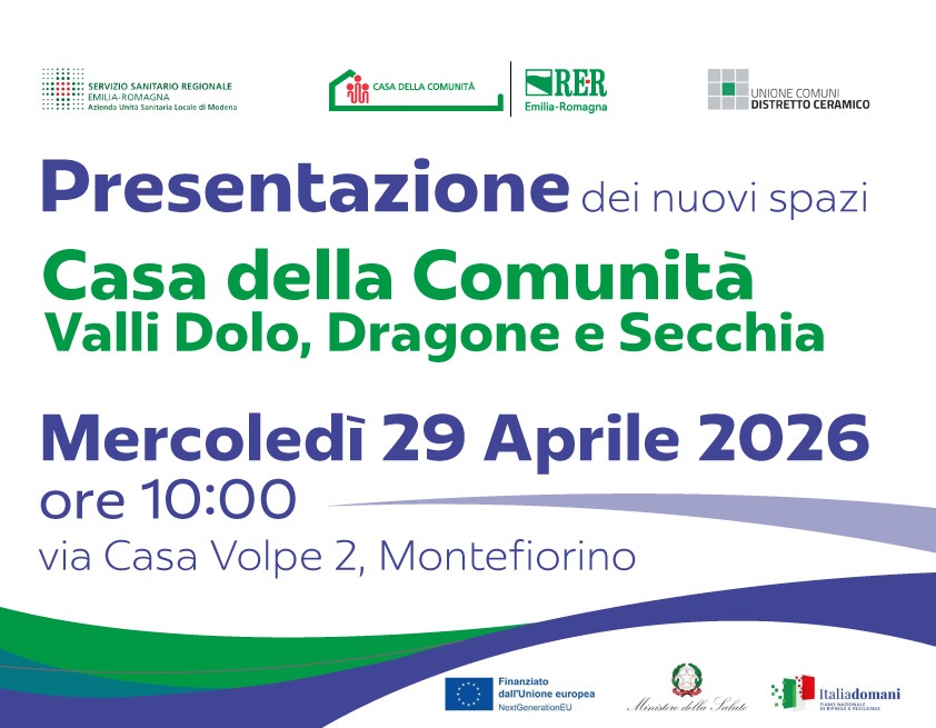 Presentazione dei nuovi spazi Casa della Comunità valli Dolo, Dragone e Secchia mercoledì 29 Aprile 2026 ore 10.00 Via Casa Volpe, 2 Montefiorino