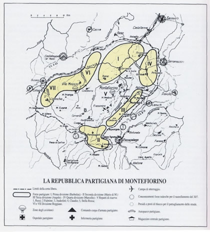 Montefiorino: Storia e territorioLa Repubblica Partigiana di Montefiorino è il primo tra i più noti territori italiani che durante la Resistenza riuscirono a liberarsi militarmente dall'occupazione nazifascista, proclamandosi indipendenti ed avviando una esperienza di autogoverno democratico. Essa visse dal 17 giugno al 1 agosto 1944, dopo di ché le truppe nazifasciste riuscirono a riprenderne il controllo: il suo territorio si estendeva su parte delle zone montuose delle provincie di Modena e Reggio, e comprendeva gli attuali comuni di Montefiorino – ove venne posta la sede del governo – Frassinoro, Prignano sulla Secchia, Palagano, Polinago, Toano, Ligonchio e Villa Minozzo.La storia della repubblica inizia l'8 settembre 1943, quando il nuovo governo che aveva sostituito quello fascista firmò l'armistizio con gli Alleati. Ciò pose fine alla guerra tra l'Italia e gli Alleati stessi, ma inaugurò l'occupazione nazista della penisola – giacché i Tedeschi non erano più nostri alleati – e determinò anche la nascita della Repubblica Sociale Italiana (o Repubblica di Salò), entità che raccolse tutti i Fascisti che desideravano rimanere alleati alla Germania e rinnegavano l'armistizio ed il governo Badoglio. Ebbe così inizio anche il periodo della Resistenza.Alla data del 8 settembre le forze armate italiane, praticamente senza ordini dagli alti comandi, si trovarono allo sbando: sulla strada tra le Piane di Mocogno, dove avevano svolto esercitazioni, e Monchio si trovava anche un reparto di allievi ufficiali dell'Accademia di Modena, che nell'incertezza più assoluta sul da farsi si sciolse, lasciando sul posto anche armi ed attrezzature belliche.torna suA quella data solo una parte dell'Italia era stata liberata dagli Alleati, e tutta l'area centrosettentrionale della penisola era sotto il controllo della Repubblica Sociale e dei Nazisti. Questi decretarono la chiamata alle armi nell'esercito “repubblichino” per moltissimi giovani, i quali però decisero di non rispondere, e per sfuggire all'arresto con l'accusa di diserzione e tradimento si rifugiarono nelle aree di montagna: furono loro, nel nostro caso provenienti da Sassuolo e Modena, a recuperare le armi lasciate dai cadetti ed a iniziare, nell'autunno 1943, le prime azioni di disturbo e guerriglia contro i Nazifascisti.Durante l'inverno 1943 - 1944 le truppe nazifasciste non riuscirono a condurre operazioni risolutive contro i partigiani, le cui file, in clandestinità, lentamente si allargavano ed organizzavano. Ma la reazione, basata sull'impiego dei metodi messi a punto in Russia, non si fece attendere: il 18 marzo 44 un massiccio contingente nazifascista, comprendente tra l'altro reparti di paracadutisti tedeschi e di artiglieria, raggiunse la rocca di Montefiorino e da lì bombardò pesantemente i paesi di Susano, Costrignano e Monchio, mentre altre truppe salivano dal fondovalle del Dragone rastrellano e poi uccidendo tutti coloro che incontravano. Le vittime della strage furono 136 ed i tre paesi furono in buona parte distrutti. Anche Montefiorino fu distrutta, nei giorni successivi toccò alle borgate di Civaco, Cervarolo e Ripatonda, dove sul campo rimasero un'altra trentina di civili.Una celebre immagini della via principale di Montefiorino dopo le distruzioni attuate dai Nazifascisti nel 1944Una celebre immagini della via principale di Montefiorino dopo le distruzioni attuate dai Nazifascisti nel 1944.Questa azione di vero terrorismo mirava a spaventare la popolazione, togliendole la volontà di appoggiare i partigiani, ma raggiunse invece l'obbiettivo contrario, mostrando chiaramente cosa in realtà fosse la Repubblica Sociale, e da quel momento le file partigiane si ingrossarono rapidamente. In Valdragone si costituì la brigata “Giustizia e Libertà”, comandata da Mario Allegretti. Entro la fine della primavera nell'area di Montefiorino, nella quale dopo il massacro i Nazifascisti non si recavano ormai più, si erano radunati circa cinquemila partigiani comunisti della divisione Modena Armando (guidata da Mario Ricci), mentre a Fontanaluccia avevano sede i partigiani democristiani guidati da Ermanno Gorrieri. Il 17 giugno preso stabilmente il controllo del territorio, essi insieme ad altri reparti di stanza in altre zone, costituirono un governo democratico autonomo con sede nella Rocca di Montefiorino, dando vita alla Repubblica, mentre tutti i combattenti si riunirono nel Corpo d'Armata centroEmilia, al comando di Armando. Si pensò inoltre alla riorganizzazione civile del territorio libero, alle elezioni dei sindaci, alla costituzione di un ospedale, al rifornimento di viveri ed a tutte le incombenze alle quali un governo deve provvedere. Vi furono però anche arresti, processi ed esecuzioni di presunti collaborazionisti. Nel frattempo proseguivano, al di fuori del territorio liberato, le azioni di disturbo, volte a scongiurare un probabile contrattacco nazifascista, mentre gli Alleati paracadutavano nella zona liberata rifornimenti, attrezzature ed alcuni ufficiali di collegamento.Carta della disposizione dei reparti partigiani durante il periodo di esistenza della Repubblica PartigianaCarta della disposizione dei reparti partigiani durante il periodo di esistenza della Repubblica Partigiana (da E. Baroni (a cura di), L'Appennino modenese di ponente, Fiorano Modenese, 1996)L'esistenza della Repubblica fu stroncata, dopo soli 45 giorni, da un nuovo massiccio attacco nazifascista: i reparti partigiani, dopo aver tentato una valida resistenza, rendendosi conto dell'impossibilità di resistere fino all'arrivo degli Alleati il cui fronte era ancora tra Romagna e Toscana, si dispersero. Montefiorino, Gombola, Piandelagotti, Toano, Villaminozzo vennero bruciati, mentre la popolazione, memore della strage di Monchio, si mise in salvo con la fuga.Dovettero passare ancora molti mesi prima che gli Angloamericani riuscissero a liberare, nell'aprile 1945, Modena e Montefiorino, mesi durante i quali i par