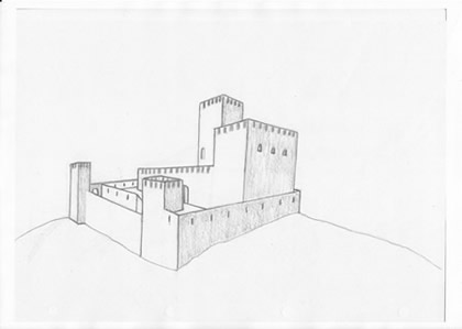 Schizzo dell'ipotesi ricostruttiva della rocca dopo il suo potenziamento del 1245 e prima della distruzione operata poco dopo dalle milizie comunali modenesi.
